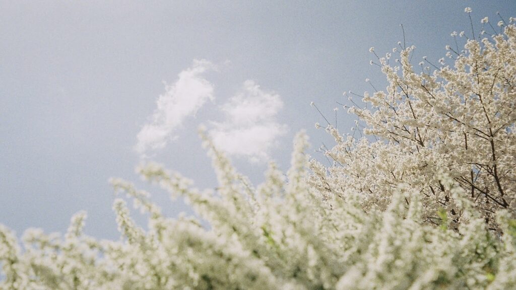 蕾の頃は赤みが強く、開き始めは淡いピンク色。しかし、花弁が完全に広がるとアントシアニンが分散し、さらに光を反射しやすくなるため、我々の目にはほとんど白に近い、ほんのりとした淡紅色に映る。